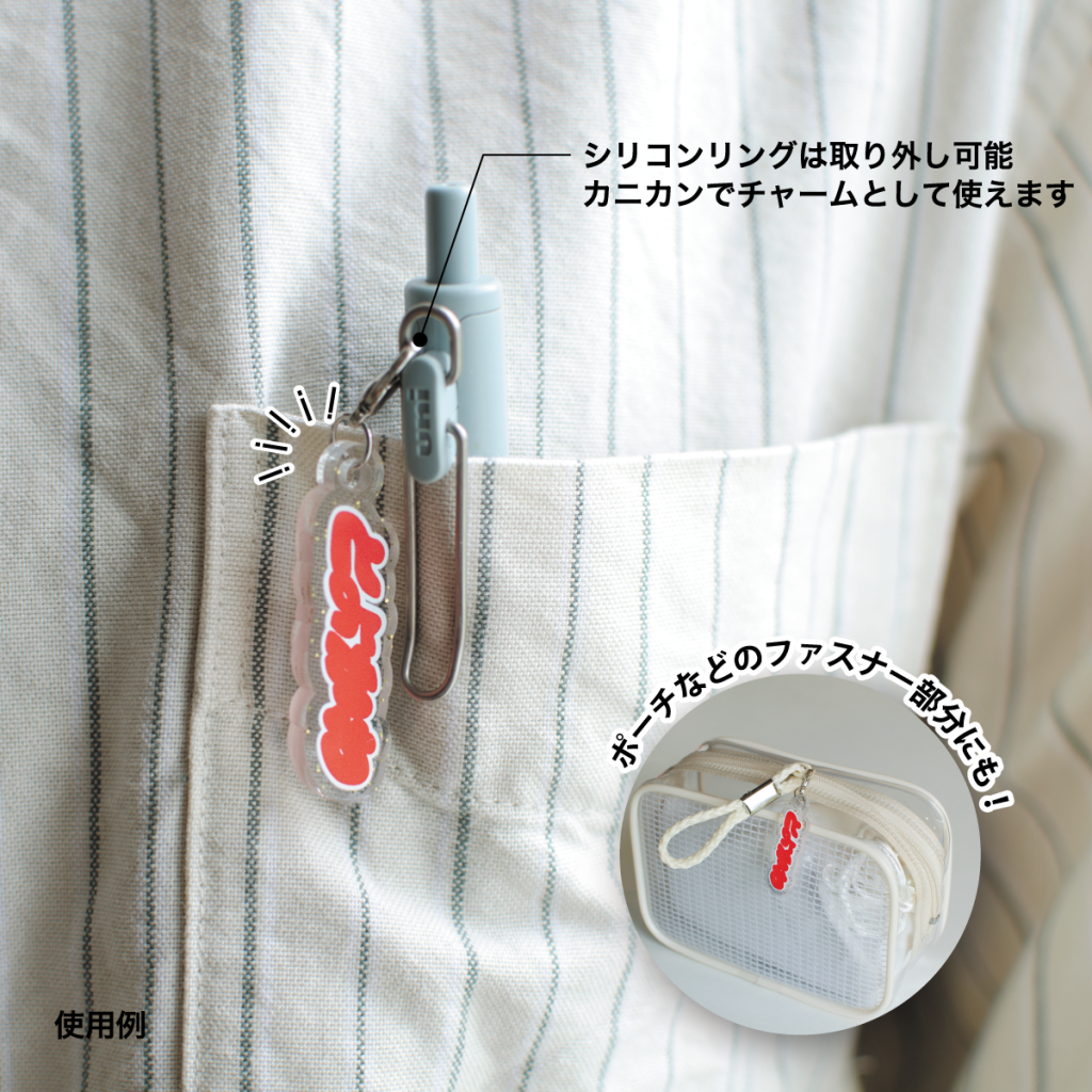 アンブレラマーカーとしてだけでなく、シリコンリングから取り外せばポーチなどのチャームとしてもマルチに使えます。