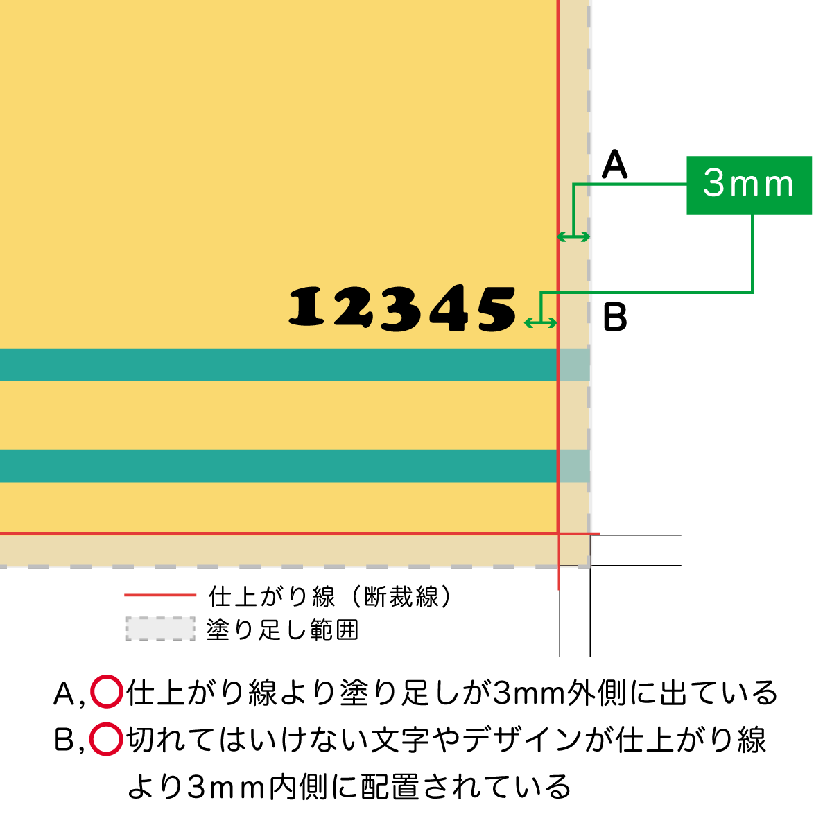 A, ○ 仕上がり線(断裁線)より塗り足しが3mm外側に出ている