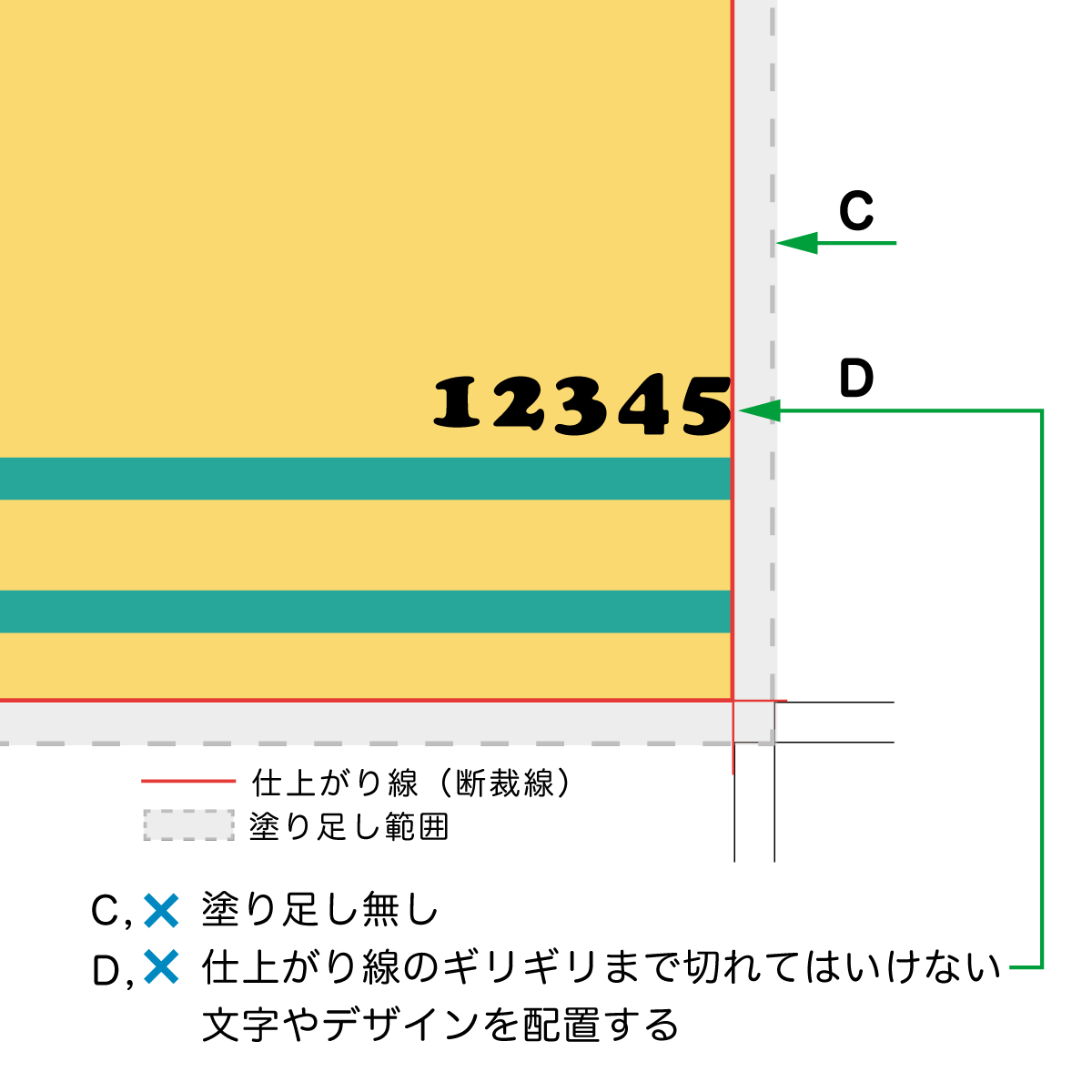 D, × 仕上がり線のギリギリまで切れてはいけない文字やデザインを配置する